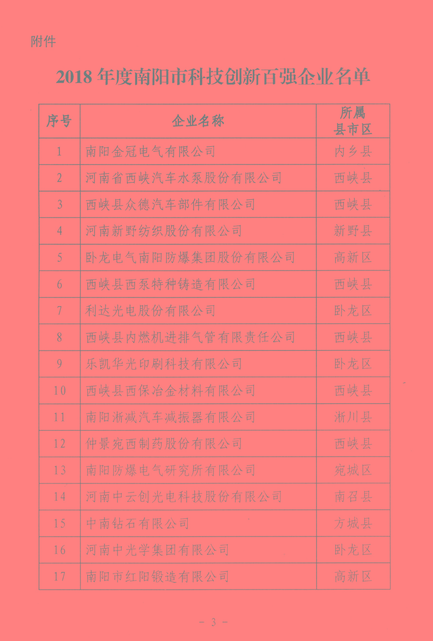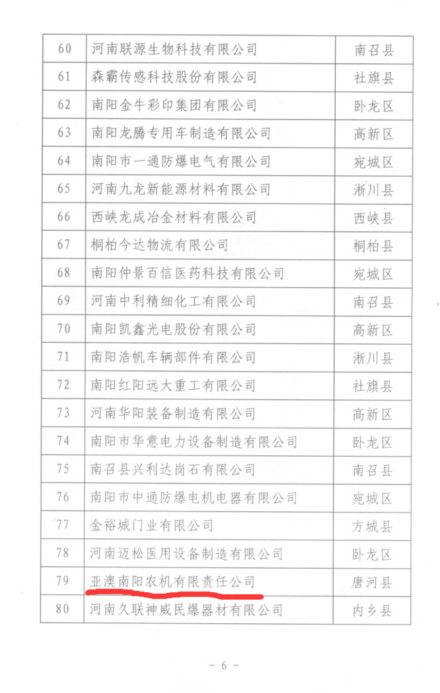 為深入實施創(chuàng)新驅(qū)動發(fā)展和“兩輪兩翼”發(fā)展戰(zhàn)略,增強全市企業(yè)自主創(chuàng)新能力和核心競爭力,引領(lǐng)促進(jìn)企業(yè)成為技術(shù)創(chuàng)新主體,按照《南陽市科技創(chuàng)新百強企業(yè)考核評定辦法》要求,亞澳農(nóng)機等6家企業(yè)榮獲此榮譽。