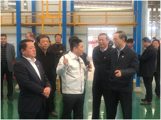 在唐河縣的亞澳南陽農(nóng)機有限公司,黃省長一行實地察看了企業(yè)生產(chǎn)現(xiàn)場,了解企業(yè)生產(chǎn)經(jīng)營、產(chǎn)品保護性耕作,防止耕作過程中的秸稈焚燒和揚塵、技術(shù)創(chuàng)新等情況。對該公司的智能激光切割、自動化機器人焊接及PLC粉體涂裝生產(chǎn)線,環(huán)保除塵系統(tǒng)詳細查看,邊聽邊問,尤其對亞澳農(nóng)機發(fā)展綠色清潔生產(chǎn)建設(shè)的粉體涂裝產(chǎn)線,和屋頂光伏電站、雨水收集循環(huán)利用大手筆投入尤為贊嘆。聽史炳哲總經(jīng)理匯報亞澳農(nóng)機涂裝設(shè)備是目前先進的環(huán)形磁芯的粉體涂裝線,其采用PLC人機界面控制系統(tǒng),使各工序自動化運行,所有工序一次性完成,比傳統(tǒng)振動雙面烘烤涂裝的品質(zhì)更加優(yōu)良,更節(jié)省涂料,還可實現(xiàn)廢料回收再利用,并實現(xiàn)了全自動生產(chǎn)涂裝,高效節(jié)能。