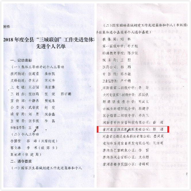 412日,唐河縣召開2018年度“三城聯(lián)創(chuàng)”總結(jié)大會(huì)。大會(huì)宣讀了表彰先進(jìn)集體及先進(jìn)個(gè)人的決定。亞澳農(nóng)機(jī)獲得2018年度國家園林縣城創(chuàng)建工作先進(jìn)集體。