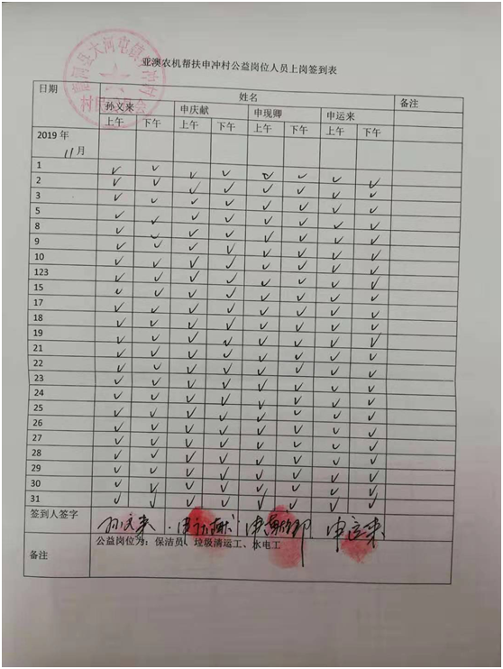 亞澳農(nóng)機(jī)每月給公益崗位貧困戶工作人員發(fā)放工資500元/月人
