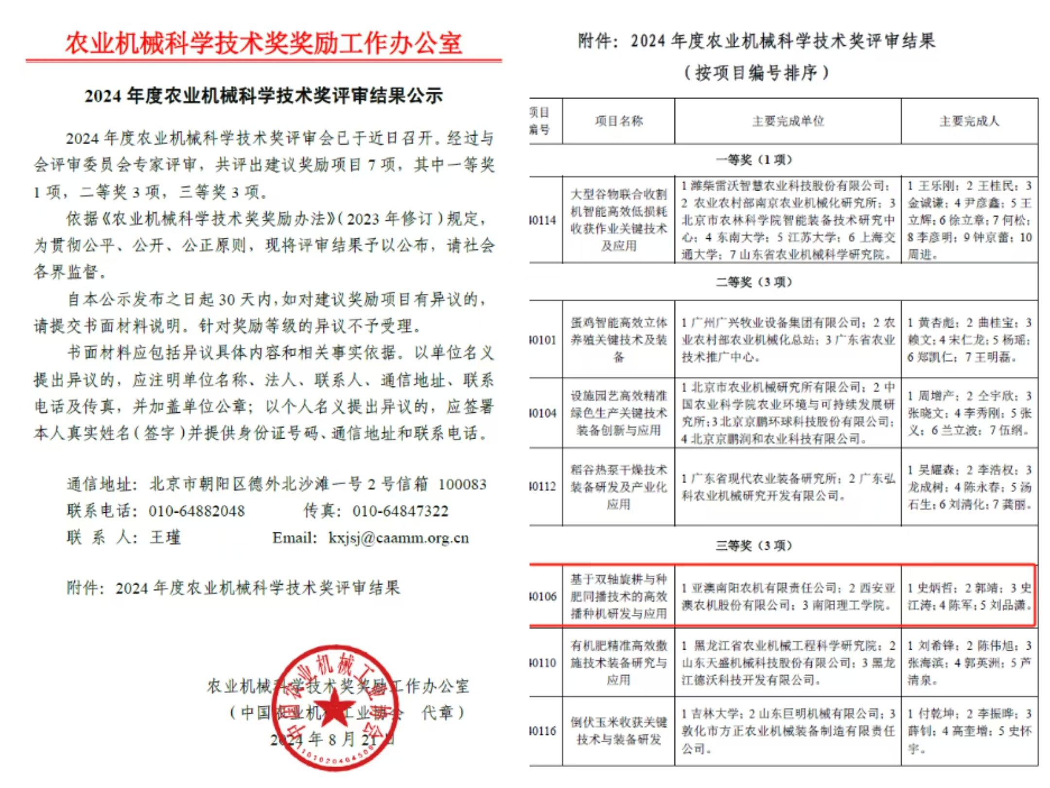 榮耀時刻:亞澳農(nóng)機榮獲2024年度農(nóng)業(yè)機械科學技術(shù)獎
