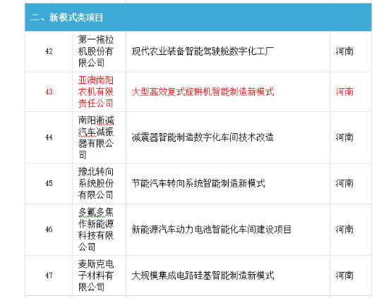 近日,亞澳農(nóng)機(jī)被國(guó)家工信部評(píng)為2017年智能制造綜合標(biāo)準(zhǔn)化與新模式應(yīng)用示范企業(yè)。據(jù)了解,這次全國(guó)智能制造綜合標(biāo)準(zhǔn)化專項(xiàng)項(xiàng)目批準(zhǔn)企業(yè)43 家,河南省內(nèi)2家,為機(jī)械工業(yè)第六設(shè)計(jì)研究院,洛陽(yáng)軸研科技股份有限公司國(guó)有大型企業(yè);新模式應(yīng)用立項(xiàng)51家,河南省僅批準(zhǔn)6家,亞澳智能化制造新模式成為業(yè)界首家,并獲得國(guó)家專項(xiàng)資金補(bǔ)貼。