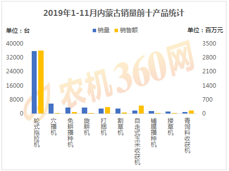2019年1-11月,上榜內(nèi)蒙古用戶購(gòu)機(jī)量前十的農(nóng)機(jī)產(chǎn)品如下圖所示,輪式拖拉機(jī)、穴播機(jī)、免耕播種機(jī)等10種農(nóng)機(jī)合計(jì)購(gòu)買(mǎi)力5.86萬(wàn)臺(tái),是內(nèi)蒙古農(nóng)機(jī)總銷(xiāo)量的86.8%,對(duì)這10類(lèi)農(nóng)機(jī)的購(gòu)機(jī)支出達(dá)42.4億元。