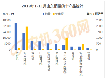 2019年1-11月,上榜山東用戶購(gòu)機(jī)量前十的農(nóng)機(jī)產(chǎn)品如下圖所示,微耕機(jī)、輪式拖拉機(jī)、旋耕機(jī)等10種農(nóng)機(jī)合計(jì)購(gòu)買(mǎi)力11.5萬(wàn)多臺(tái),是山東農(nóng)機(jī)總銷(xiāo)量的86.54%,對(duì)這10類(lèi)農(nóng)機(jī)的購(gòu)機(jī)支出達(dá)38.55億元。