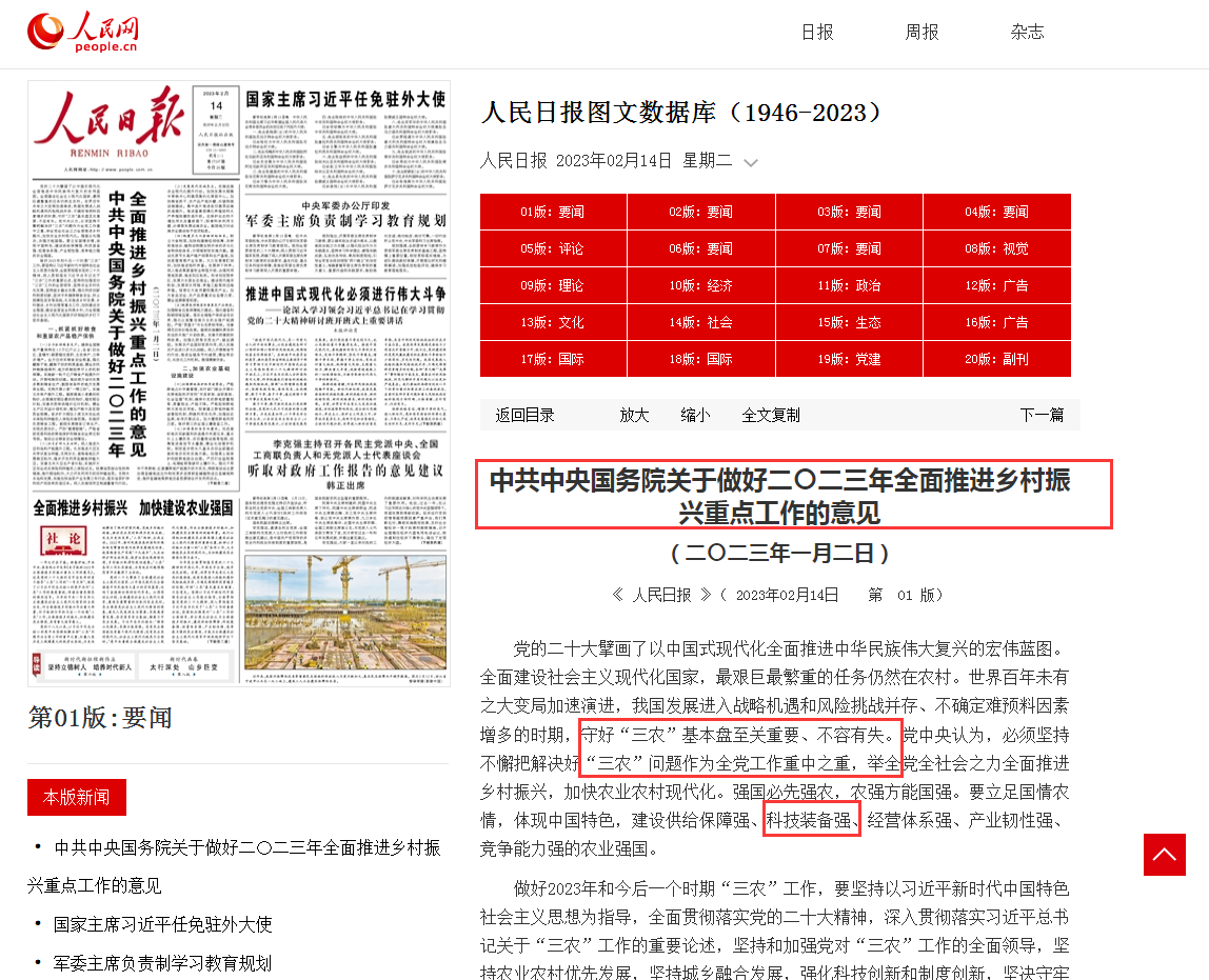 2023年中央一號文件2月13日正式發(fā)布。文件提出,要立足國情農(nóng)情,體現(xiàn)中國特色,建設(shè)供給保障強(qiáng)、科技裝備強(qiáng)、經(jīng)營體系強(qiáng)、產(chǎn)業(yè)韌性強(qiáng)、競爭能力強(qiáng)的農(nóng)業(yè)強(qiáng)國。